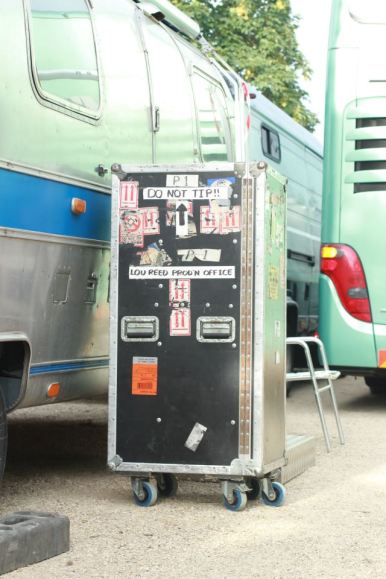 Inaccessible et invisible, personne ne l’a vu rentrer dans les backstages où l’accès est interdit au public. On devine par ailleurs sa présence grâce aux caissons et aux malettes marqués à son nom, déposés derrière sa loge, et aux matériels musicals transportés par des hommes à la voix portante et étrangère. Les artistes du festival se rendent tous au Catering, restaurant aménagé pour le festival au sein des backstages. Du restaurant, on peut voir la loge de Lou Reed. Une simple loge parmi les autres, qui reste secrète. Personne n’y entre, personne n’en sort. Son passage n’est qu’à 22h15, il n’est que 20h30 et il n’a pas été aperçu depuis son arrivée. Les autres artistes déambulent dans le carré VIP, rencontrent les festivaliers, plaisantent avec les hommes de la sécurité… mais Lou Reed reste secret jusqu’au moment où l’on apprend qu’il a souhaité se faire amener son plateau repas dans sa loge. Deux jeunes femmes transportent alors deux immenses plateaux bien garnis jusqu’à lui et reviennent, silencieuses. Sûrement impressionnées. Mais moi je décide de rester, pour attendre un peu, pour guetter « Sa Majesté », mais je prends conscience tout de même qu’approcher Lou Reed ne sera pas une tâche facile.