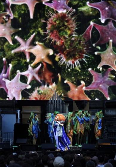 Après l’arrivée des deux musiciens et des douze choristes qui l’accompagnent sur sa tournée, Bjork entre en scène drapée de bleu, perchée sur ses semelles compensées et arborant une choucroute rousse à faire pâlir notre Yvette Horner nationale. A gauche, le batteur/percus (Manu Delago); à droite Max Wiesel au synthé et ordi, entourent les choristes réparties sur une plate-forme surplombée d’un écran géant.