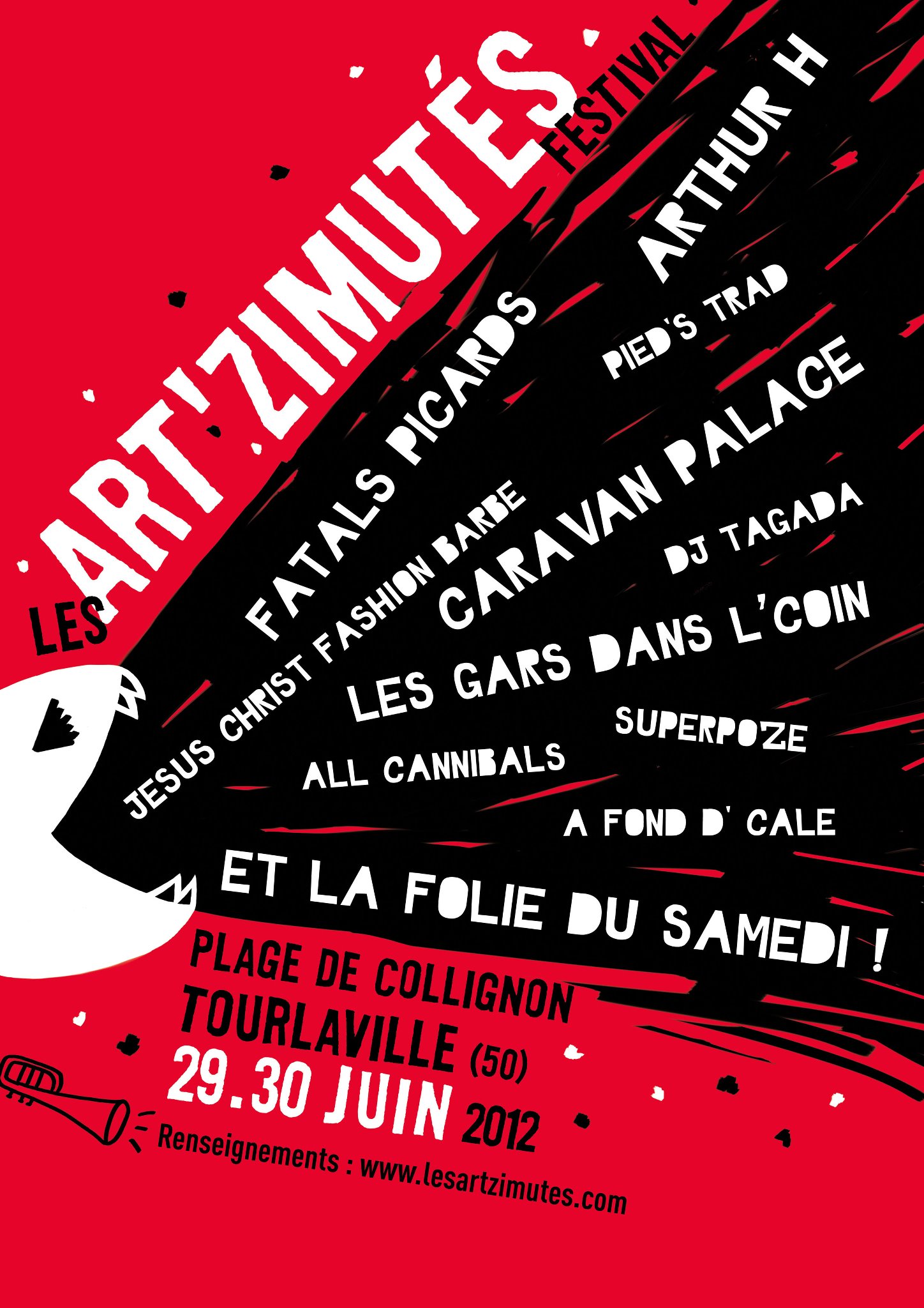 Il est vrai que chez moi, en Normandie, dans la Manche plus exactement, minimes sont le nombre d’évènements musicaux, où des artistes assez connus viennent se produire. Il y a bien le célèbre Festival Papillons de Nuits, à Saint-Laurent-De-Cuves, et Jazz sous les Pommiers, dont je vous ai déjà parlé sur le site, mais ils se déroulent tous deux durant la période scolaire… Alors, qu’il y a-t-il d’intéressant l’été, niveau musique, dans la Manche. Et bien, il y a le petit festival « Les Art’zimutés », juste à côté de Cherbourg, à deux pas de la plage. Le slogan du festival ? « Le festival dont vous êtes le héros ! ». Le site du festival accueille les plus jeunes d’entre nous lors une après-midi culturelle en proposant des jeux en tout genre et des activités de plein-air (planche à voile, natation, athlétisme, beach-volley), et bien-sûr, le soir des concerts. Et même si ce festival peut paraître assez « enfantin », il ne faut pas croire que les groupes qui y jouent sont tournés vers ce public. Loin de là. Car attention, parmi les artistes qui y ont déjà joué, on peut citer ne serait-ce que Eiffel, Yael Naïm, Les Têtes Raides, Les Ogres De Barback. Et cette année, le festival ne s’est pas moqué de nous : Caravan Palace, Arthur H et Les Fatals Picards en tête d’affiche ! Les festivaliers ont répondu présents devant la belle programmation que les organisateurs nous offraient.