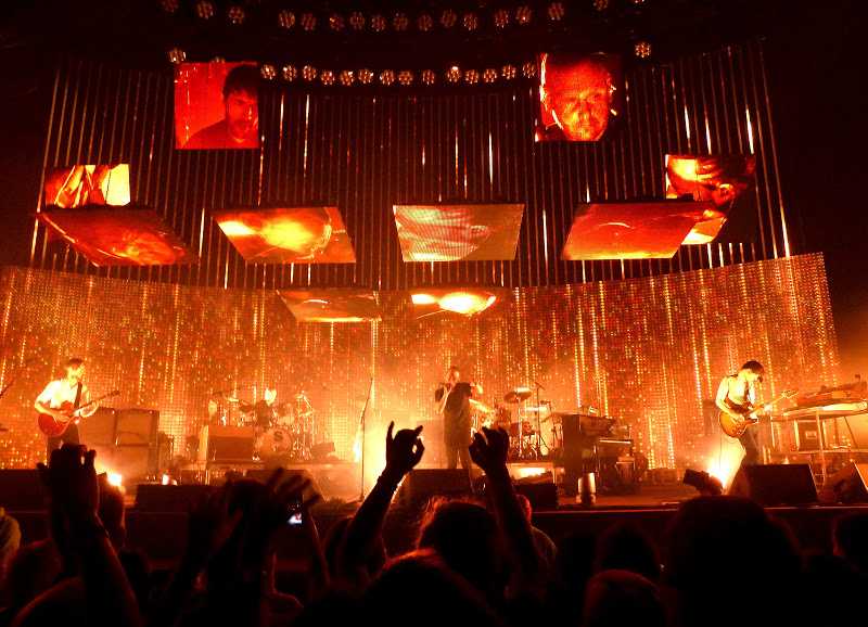Radiohead a gardé sensiblement en fond le même décor que sur la précédente tournée avec un mûr de néons. L’innovation vient des douze écrans mobiles qui surplombent le groupe, agrémentés de 5 autres sur le devant de la scène. En plus du jeu de lumière, un ballet d’images de la prestation du groupe est renvoyé par ces écrans paraissant flotter sur la tête des musiciens. Le groupe est disposé sur scène comme d’habitude, avec de gauche à droite Ed O’Brien, Thom Yorke et Johnny Greenwood au premier plan ; au second, Colin Greenwood qui a rejoint son chanteur dans le clan des barbus, est entouré du batteur habituel du groupe Phil Selway et du batteur de Portishead, Clive Deamer, présent sur les prestations live sur la tournée de King Of Limbs.