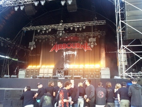 Voir Airbourne en concert, ça reste toujours une expérience attendue de longue date. Pour ma part, ce show du dimanche 9 juin 2013 à Amnéville en clôture du festival Sonisphere allait être mon deuxième des australiens, après un premier au même endroit en 2011, où Joël, en bon frontman nous avait gratifié d’un solo de guitare perché en haut de la structure de la scène, au dessus des écrans géants. Cette année ils passaient en tout dernier sur le running order, juste après Iron Maiden qui jouait sur la mainstage. Ayant déjà vu la Vierge de Fer en 2011 et n’étant pas particulièrement fan, je suis allé me mettre devant la deuxième scène de façon à être le plus près possible des barrières lors du concert. Et ça a payé, il y avait peu de monde, j’ai donc vite été au premier rang. Le Sonisphere avait fait une sorte d’avancée de barrières dans la fosse en forme de T dont le pied partait du milieu de la scène.