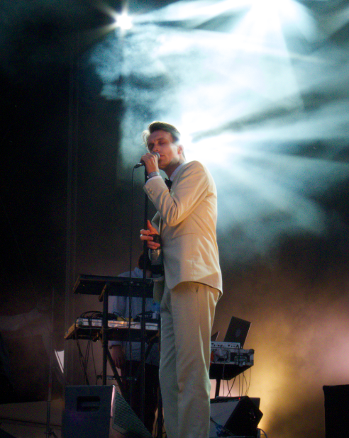 La seconde découverte de la soirée pour moi a été Efterklang: entrée sur scène du groupe danois puis de son leader Casper Clausen, vêtu d’un costard crème et d’un nœud papillon. Je ne connaissais pas alors qu’ils existent depuis 2001 me dit-on dans mon l’oreillette… Electro Pop contemplative réussie et surtout une vraie sympathie pour le chanteur qui parait très cool, profitant des moments instrumentaux pour saluer le public, s’émerveiller du site du festival, trinquant même avec la foule, le tout en mimiques pendant que le reste du groupe joue. Bonne voix, assez profonde. Des relents d’un certain style années 90 sans pourtant paraître démodé. Sur scène ils sourient presque tous, vraisemblablement heureux d’être là ce soir.