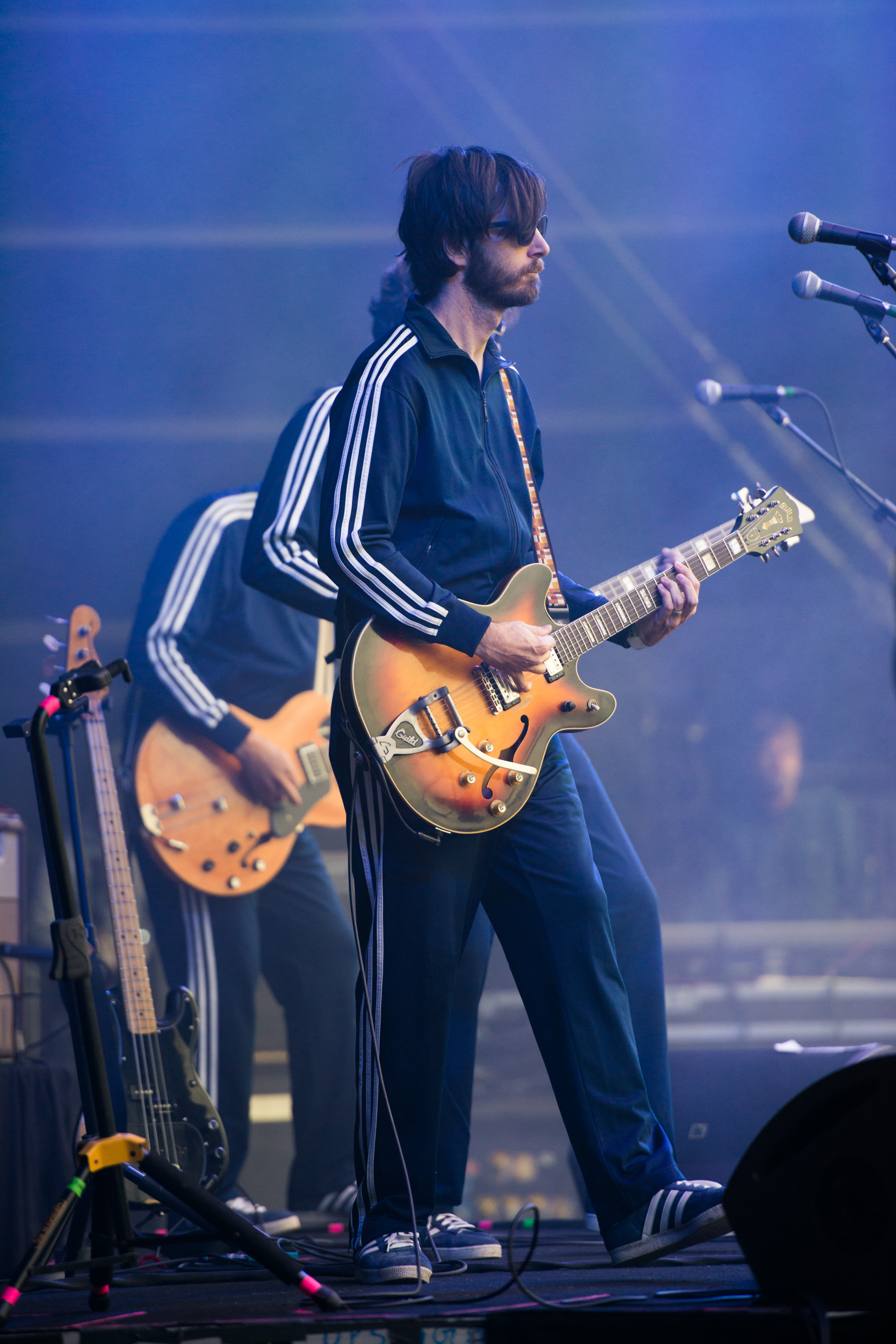 Et voilà qu’arrive une bande de quatre barbus. Dress code : Jogging et veste 100% Adidas bleu marine à rayures blanches et les fameuses baskets Gazelle qui vont avec. Batteur, guitaristes et bassiste prennent place et ouvrent la marche à un Mr E semblant sortir de son jogging matinal, un bandeau dans les cheveux assorti à sa tenue. Tous portent des lunettes noires de peur d’avoir les yeux abîmes par le soleil parisien. La bonne blague… Leur world tour 2013 étant bien articulé autour de démonstrations « guitaristiques », c’est tout naturellement que le concert commence sur une mini intro du style « présentation de nos guitares ». Mr E les rejoint sur scène et ouvre le bal avec le fameux «Cancer for the cure». La présentation du groupe, ce sera pour plus tard et on rigolera bien.