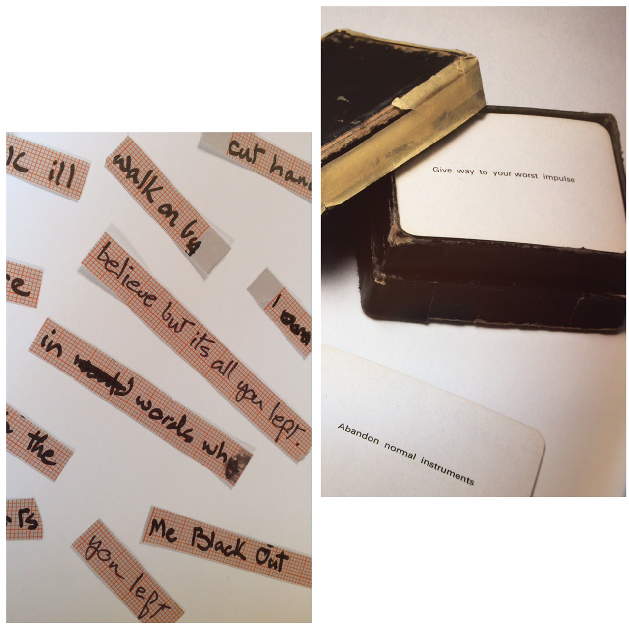 A gauche la technique dite du collage, consistant à agencer des mots ou des phrases au hasard des sonorités ou de l’émotion induite. A droite, le jeu de cartes pour stratégies obliques: Oublier ce que l’on a appris afin de toujours se surprendre.