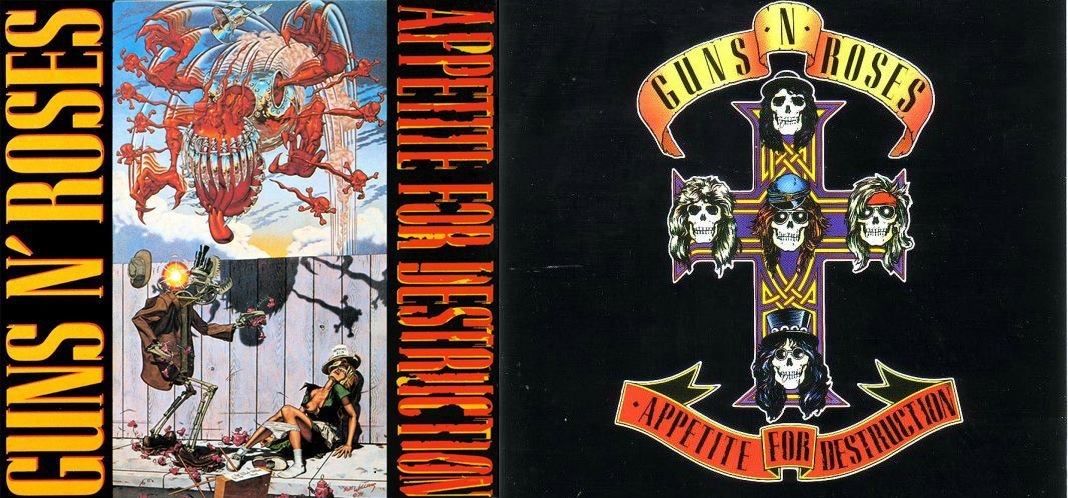 A gauche : la pochette originale d’Appetite for Destruction, par Robert Williams. A droite : La pochette de l’album à sa sortie, avec Izzy Stradlin (crâne du haut), Steven Adler (crâne de gauche), Duff McKagan (crâne de droite), Axl Rose (crâne central) et Slash (crâne du bas).