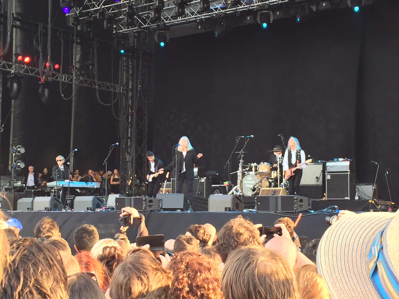 En effet Julian Casablancas et ses Voidz ont ouvert les hostilités de façon pour le moins curieuse. Un look sorti d’un autre temps, la moitié de la tête, cheveux courts teints en rose, l’autre côté long avec des mèches vertes jaunasses, habillé avec un goût que même ma grand-mère, célèbre attachée au ministère du mauvais goût aurait épinglé sans retenue. Si cela s’était arrêté là, tout aurait été pardonné, au lieu de cela Casablancas nous donne un concert creux, fichu de chansons peu attrayantes et d’un manque de caractère certain. On se demande alors ce que vont donner les Strokes le lendemain soir, mais bon… Qui vivra, verra, il est toujours salutaire d’espérer… Nous quittons donc le bonhomme et son vide intersidéral pour se positionner de manière à recevoir le prêche d’une combattante du Rock : Patti Smith qui, avec son groupe rejoue intégralement l’un de ses albums mythiques : Horses. Et là… Tout s’envole. Une magie que j’ai rarement pu voir lors d’un festival : une communion intime de la foule avec cette prêtresse dont seule la chevelure devenue blanche vient mettre un peu de lumière à son habit noir. La dame est habitée par ses textes et sait haranguer la foule présente pour distiller ses mots au plus profond des cœurs. Évidemment, elle commencera par Gloria pour reboucler dessus, de façon plus religieuse et chargée, à la fin du set, ou presque. Gloria est ici une reprise très personnelle de la chanson écrite par Van Morrisson. Patti Smith transcendant littéralement le texte par ses ajouts. Et la foule de reprendre le chorus en cœur. Même Patti en a été légèrement retournée, cela s’est vu et du coup, elle s’est livrée, donnée, offerte à cette foule, tant et si bien que pour la première fois de ma vie, j’ai senti ma gorge se serrer et mes yeux se sont mouillés derrière mes lunettes de soleil et lorsque j’ai regardé autour de moi si personne ne me voyait, j’ai constaté que tous les yeux brillaient étrangement de la même façon que les miens. Ce fut un moment très fort du début à la fin, y compris sur cette chanson écrite en pensant à Jim Morrisson ou cette dernière relatant tous les grands rockeurs jusqu’ici disparut, pour la plupart des amis à elle, on y comptera forcément Lou Reed…